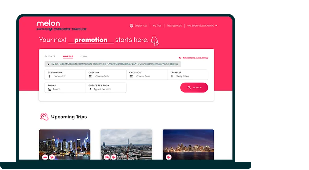 Corporate Traveller offers Melon, a travel management platform. In just a few clicks you can search and book flights, hotels, cars, and more, and choose from a wide variety of rates and fares.