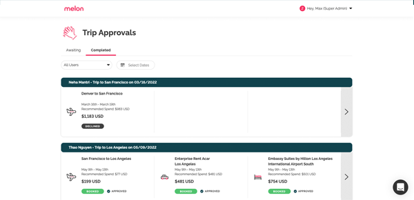 Manage your travel approvals in Melon with a configuration to meet your specific needs. Set the approval policy by traveller type and tailor Melon’s approval features to the requirements of those different groups. You can adjust the approval process to kick in at the point you want it to, including price, trip duration, flight class of service, and more. We’ll wait for your go-ahead to get the process rolling and can advise on what will work for your company.